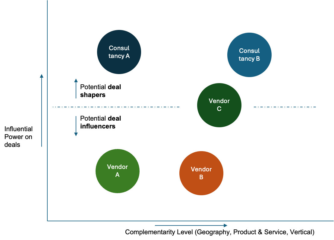Companies can categorize potential partners as either Deal Shapers or Deal Influencers and plot them along a y-axis representing their level of influence on client decision making. By mapping the degree of complementarity in geographic coverage, products/services, and vertical markets on the x-axis a clear visualization of partnership priorities emerges.